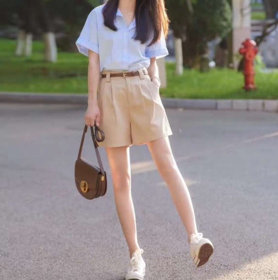 (2)白色:白色也是一種百百搭色,他給人的感覺往往是清新高級的感覺,搭配上長袖襯衫和卡其色短褲,整體衣服質(zhì)感有所提升,還能夠給人一種精英女性的感覺,當(dāng)然,對于皮膚膚色本身比較黑的小伙伴來說,我們可以選擇白色T恤來搭配哦!