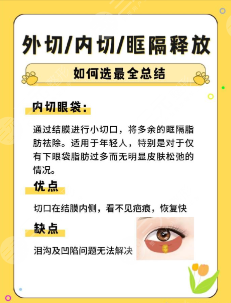 | 對(duì)比維度 | 眶隔脂肪釋放 | 外切眼袋 | 關(guān)鍵提醒 |