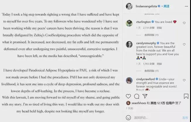 原本冷凍溶脂是用于減肥塑身的一種非入侵式美容養(yǎng)生方式,但琳達(dá)在2016年干了冷凍溶脂后,皮下脂肪不減持續(xù)上升,使她的手術(shù)緩解位置越來(lái)越更為松垮,這也讓她迫不得已道別了時(shí)尚界,并深陷焦慮抑郁中……