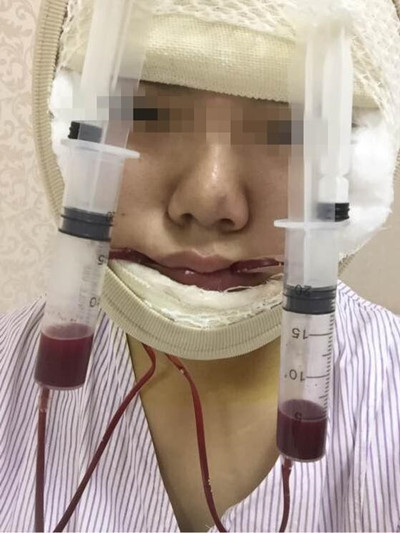剛剛做完手術(shù)出來的時候,整張臉包的嚴(yán)嚴(yán)實(shí)實(shí)的,mz藥過以后會有點(diǎn)疼,這個也很正常,打個針還疼了,跟別說是做手術(shù)磨骨了,過了就好了。嘴上那個是引流管,但是面前的針管看起來就有點(diǎn)好玩了,看著都很想笑,但是一笑,臉就疼!
