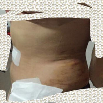 手術(shù)第五天,我自己解開了塑身衣,拉平然后又在換上,每次這個(gè)時(shí)候,我都要費(fèi)好大勁換上,因?yàn)榕龅絺跁?huì)很疼的,感覺腰部腫脹的有點(diǎn)厲害,現(xiàn)在一直在冰敷,就是希望能快速消腫,